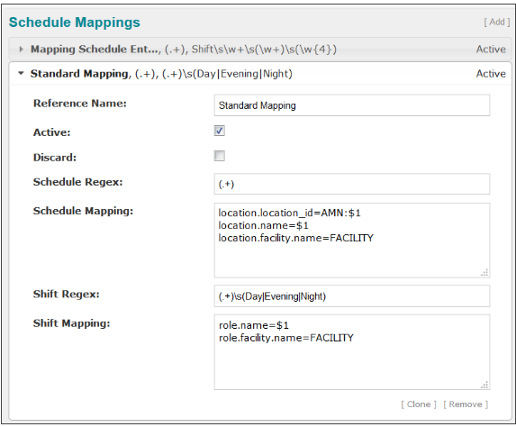 | Shift Mapping | Enter the regular expression to use to specify how to map the Shift (Assignment) name to attributes for the Vocera Platform assignment and its linked objects. This mapping is intended for use in creating Functional Role and/or Location links. This field is required unless the Discard box is checked |