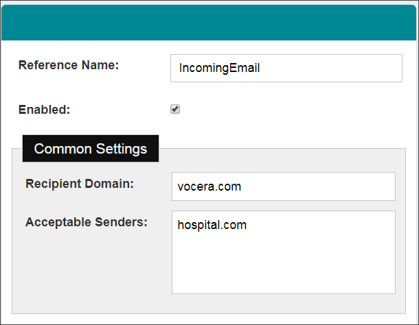 Recipient Domain | Enter the domain where the incoming emails will be received. Incoming emails are directed to this domain. This defined recipient domain is used for the incoming emails that apply to the Vocera Platform. See Configuring the Facility's Email to Integrate with Vocera for information about domain name. |