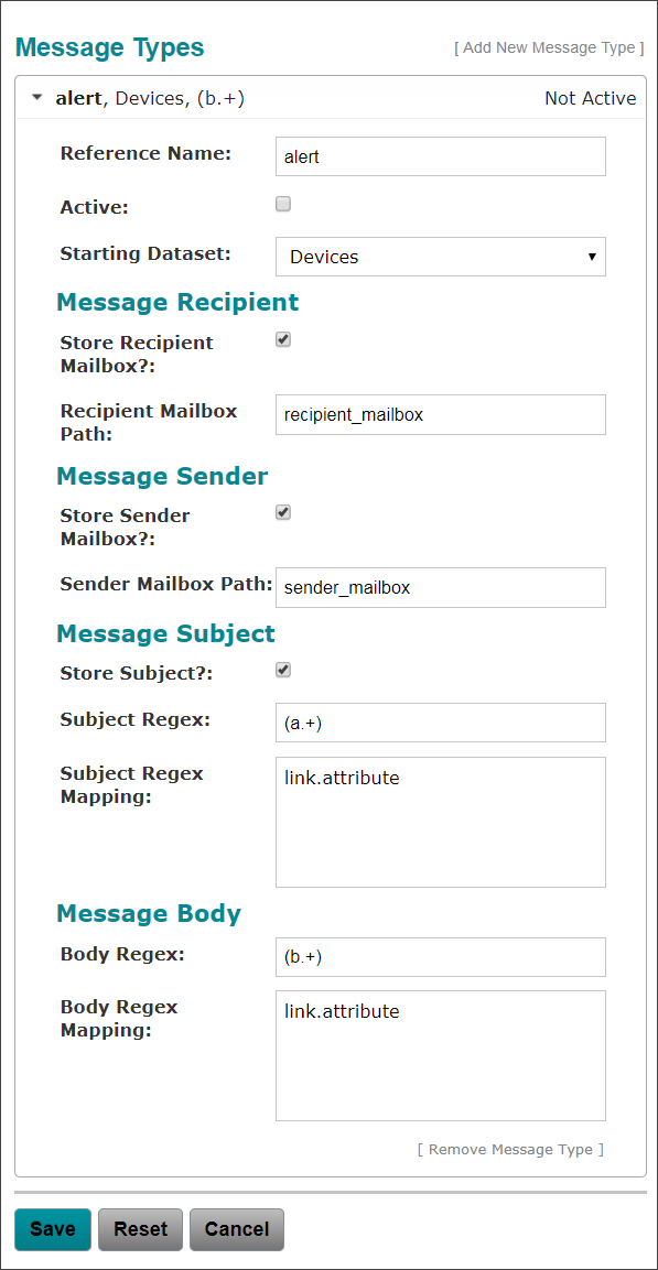 Active | Select the Active checkbox to activate this message type. The Message Type header automatically updates to display the Active status. |