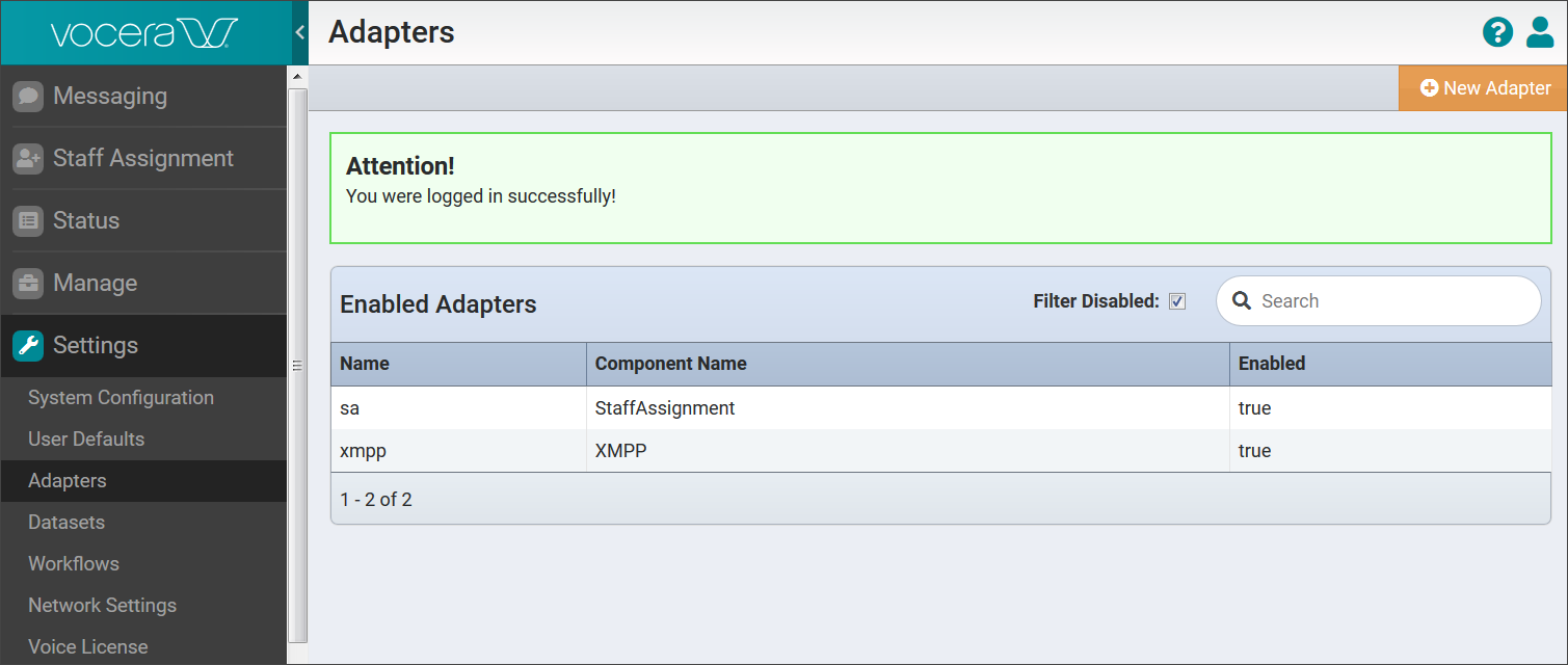 Access the Vocera Platform Web Console to work with adapters, or create a new adapter when prompted in the package import process.