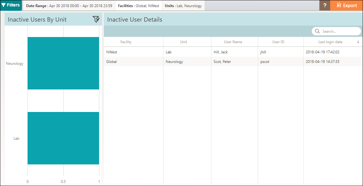 The widget displays the details of unique inactive users in each facility. Details such as username, user ID, and the unit to which the user belongs are displayed. The widget also displays the last login date of the user.