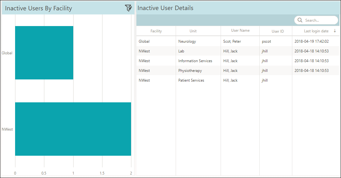 The contextual filters contain a source and a target widget. In this case, Inactive Users By Facility is the source widget, and Inactive User Details is the target widget. Click a facility to display only the corresponding data in the Details widget. For example, click Global to display only the details of the Global facility in the Details widget.