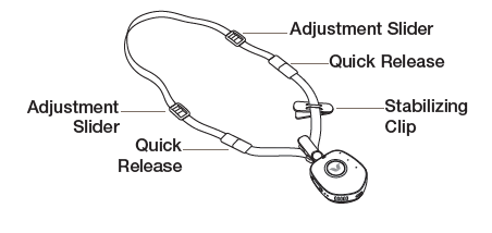 - Lanyard: The lanyard suspends the Minibadge from your neck. It includes two sliders for adjusting the length and a clip attached to your clothing to stabilize the Minibadge as you move. For safety, the lanyard also has dual quick releases.