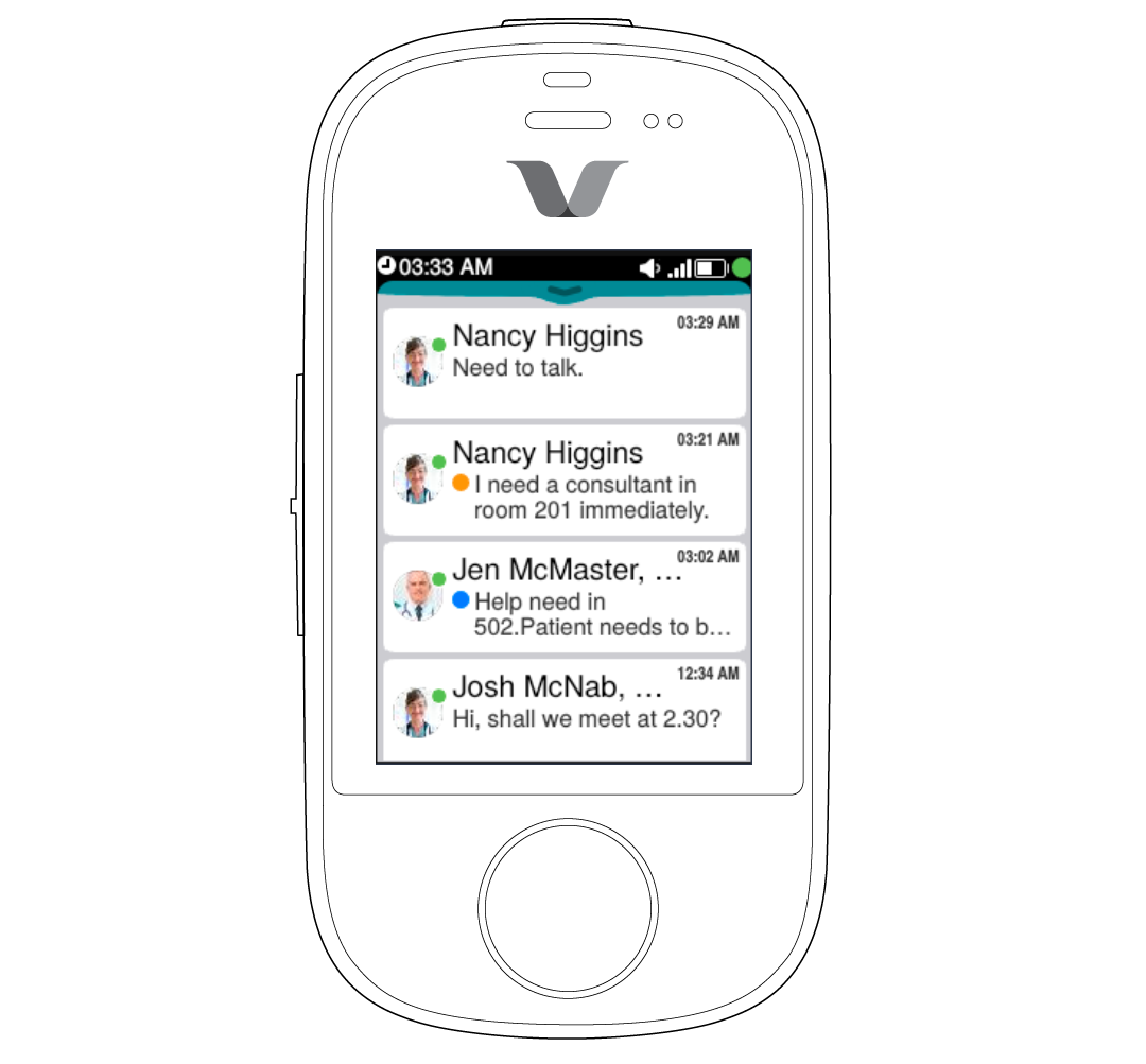 Chat bubbles are styled to differentiate sent and received messages. In the following screenshot, the conversation is between two participants. Messages of the sender are teal in color, left-aligned, and displays the time the message was received. Messages of the receiver are color-coded based on the priority icon, that is, orange for high priority and red for an urgent message. The priority icon of the received messages appear on the right edge.