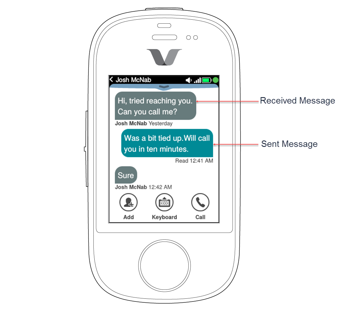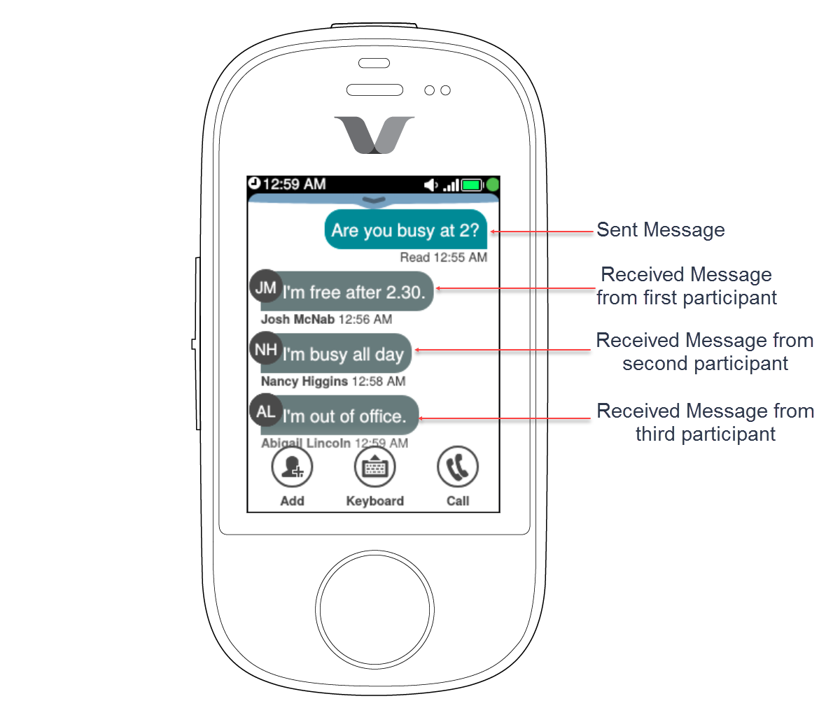 The chat priorities of multiple participants are similar to 1-to-1 chats. They differ only by including sender identification with each received message. Conversations with multiple participants have initials of the name of the sender on the left corner of the message.