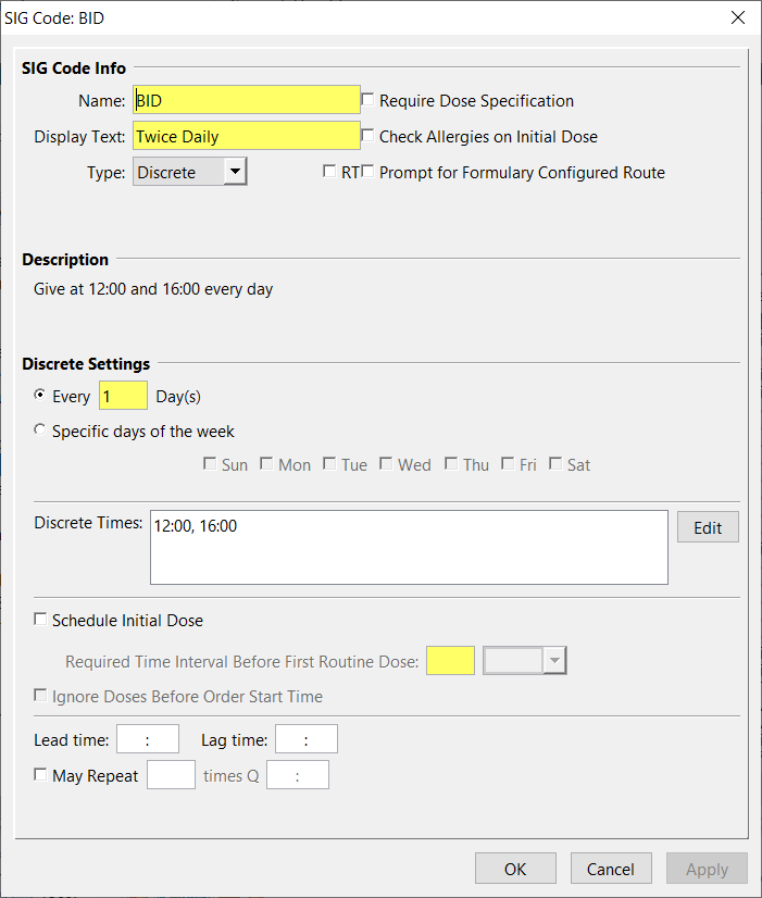 Enter Lead and Lag Times for doses on orders with this SIG code if desired.