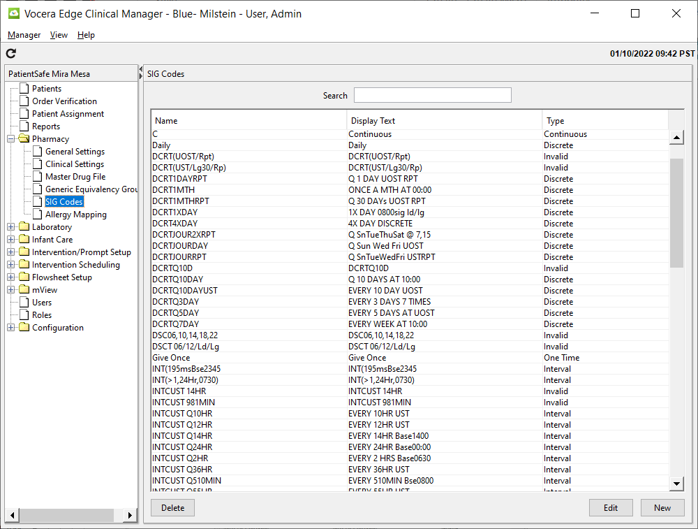 Every SIG code includes a Name (such as “BID”), which must match the name in the pharmacy system and Display Text, which is what appears on the handheld and on the MAR.