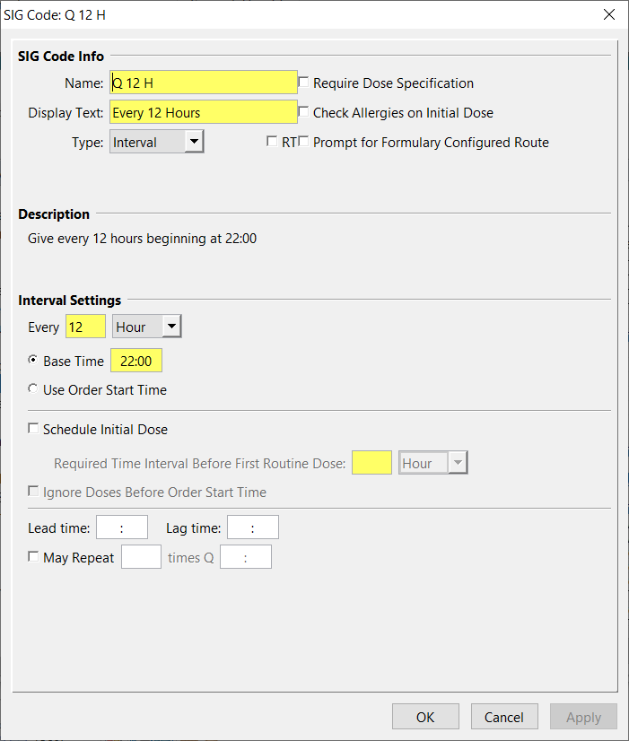 For SIG codes associated with scheduled time intervals in hours or minutes (such as Q 12 H), choose the SIG Type Interval.