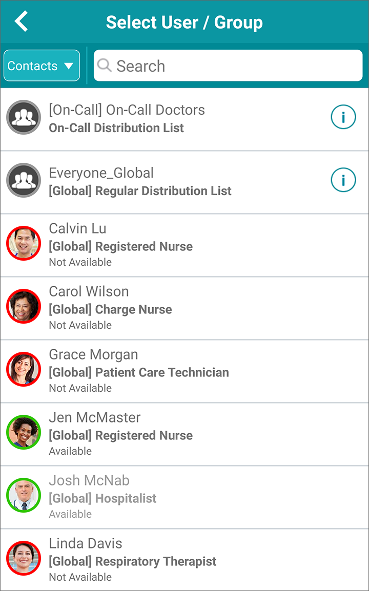 Each contact has presence and availability information provided that tells you whether the contact is at your facility and can receive your message right away. See Presence and Availability for details.