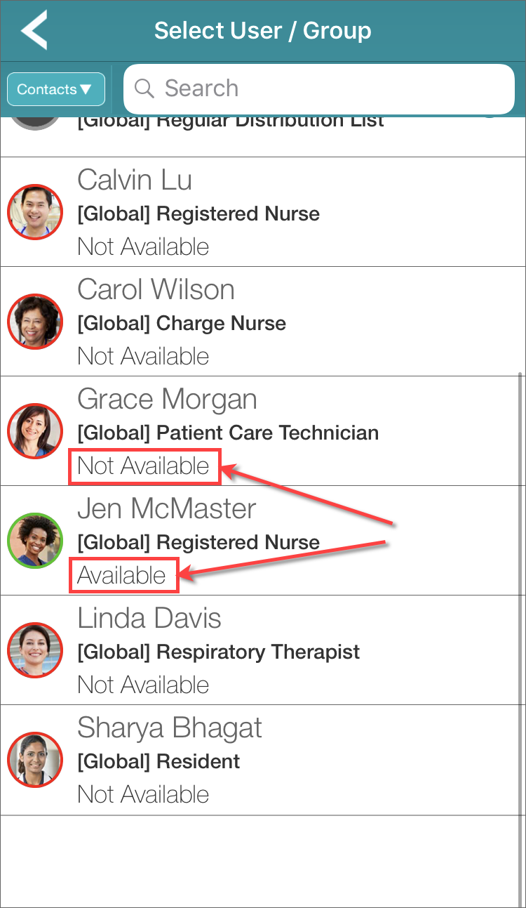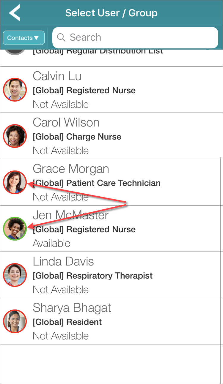 In the list of users and groups from which you select message recipients, if the contact is an individual user, the color of the ring around the contact's photo or initials indicates the contact's availability.