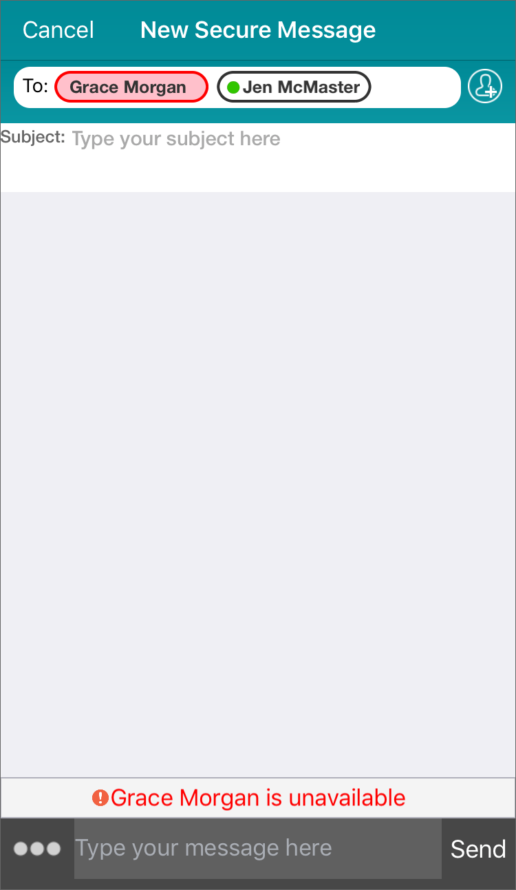 When you have added a recipient to the list of recipients displayed in the To field of the screen for the new message, the To field indicates the availability of each user that is a person. A green dot next to the user's name indicates that the user is available.