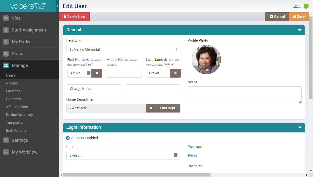 The First Name, Middle Name, and Last Fields in the General configuration section of your profile are mapped to your organizations Active Directory (AD). Vocera Platform uses the Lightweight Direct Access Protocol (LDAP) to map this information. Integrating profile information with your organization's active directory settings ensures that when your profile information is changed or updated, it is automatically updated in the Vocera system and displayed correctly.