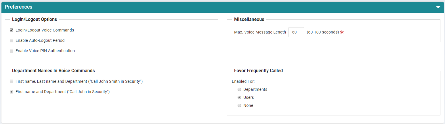 for the Vocera system. For more information, see Enabling Favor Frequently Called for Departments or Users. By default, this setting is not selected. |