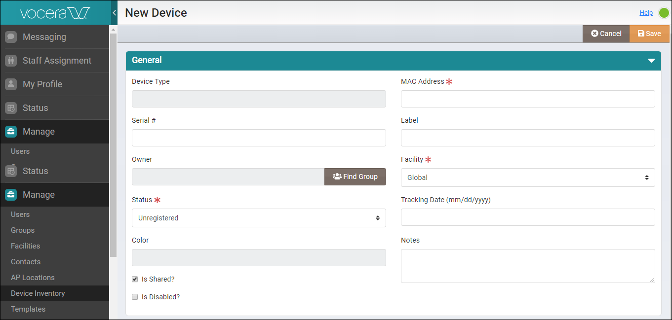 Add devices manually using the Device Inventory in the Manage section of the Vocera Platform Web Console.
