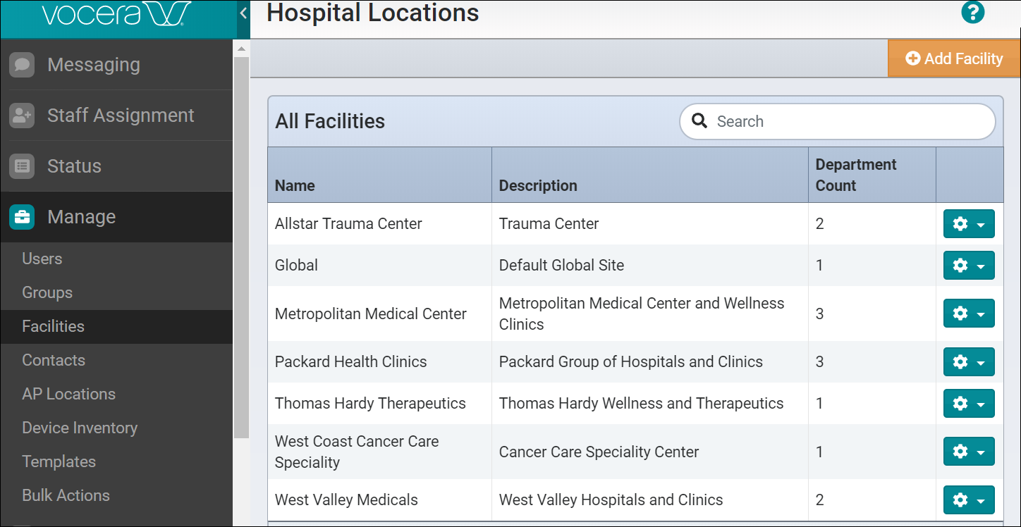 To view all the facilities in your system, select Facilities in Manage section. The Hospital Locations page appears, with a list of locations displayed in alphabetical order under the All Facilities header.