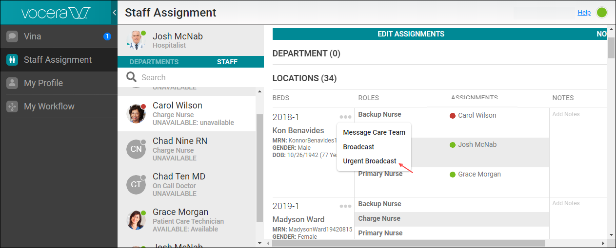 Initiate a Urgent Broadcast call from your Staff Assignment Console to your care team members.
