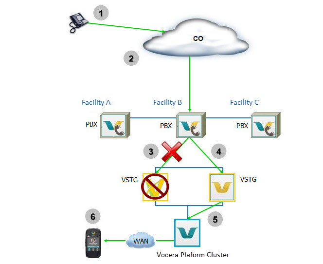 If a call made to a facility is rejected by the initial PBX for any reason (for example, the VSTG may not be responding), the call can be routed by the Central Office to another PBX at a different facility using an alternate routing plan. When the call arrives at the telephony service at the other facility, it sends the call to the Voice Service. The Voice Service knows which facility's grammars to use based on the dialed number.