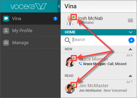 Vocera users registered for more than one client can set their presence on any supported client. The presence status is then updated everywhere. For example, if a registered Vocera Vina user sets an availability for the Web Console, the Vocera Vina application also displays the same presence status.