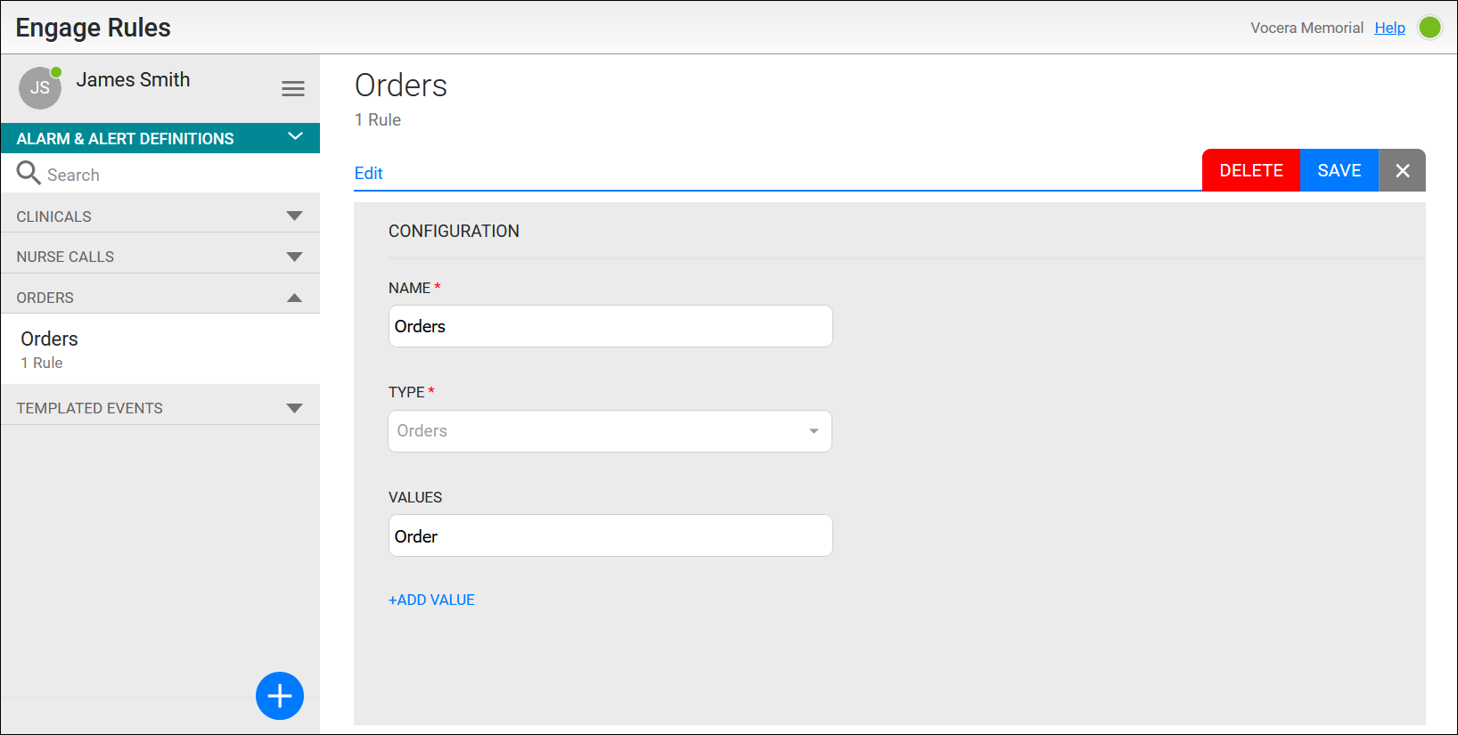 The terms "alarm" and "alert" are used interchangeably in the Engage Rules application documentation. To be specific, an Alarm is an audible, vibratory, or visual signal that a potential or actual hazard exists. Alarms can be generated from a medical device or system, such as patient monitors, ventilators, and IV pumps. The term Alert refers to an audible, vibratory, or visual signal that a potential or actual hazard exists. Alerts are generated nurse calls, labs, and orders; they are not generated from medical devices. Both alerts and alarms are incorporated in the messages communicated to medical staff via the Engage Rules application.