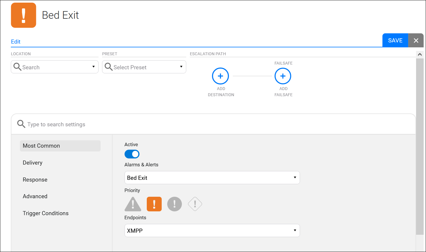 Datasets may link to other datasets and allow linked attribute access across two or more datasets. For example, an alert is linked to a patient, room, and bed to display this information on the user's device when the alarm is triggered. Each of these respective attributes is stored in separate datasets. Attributes, conditions, and rules configured on a dataset are used to manage this information. The dataset is specified in the Type field in the Alarm & Alerts Definition configuration dialog.