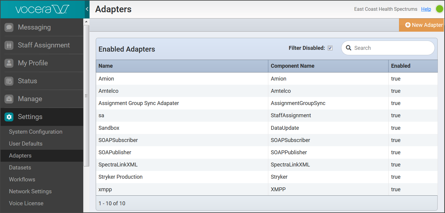 In the Vocera Engage Web Console navigation menu, select Settings, then Adapters.