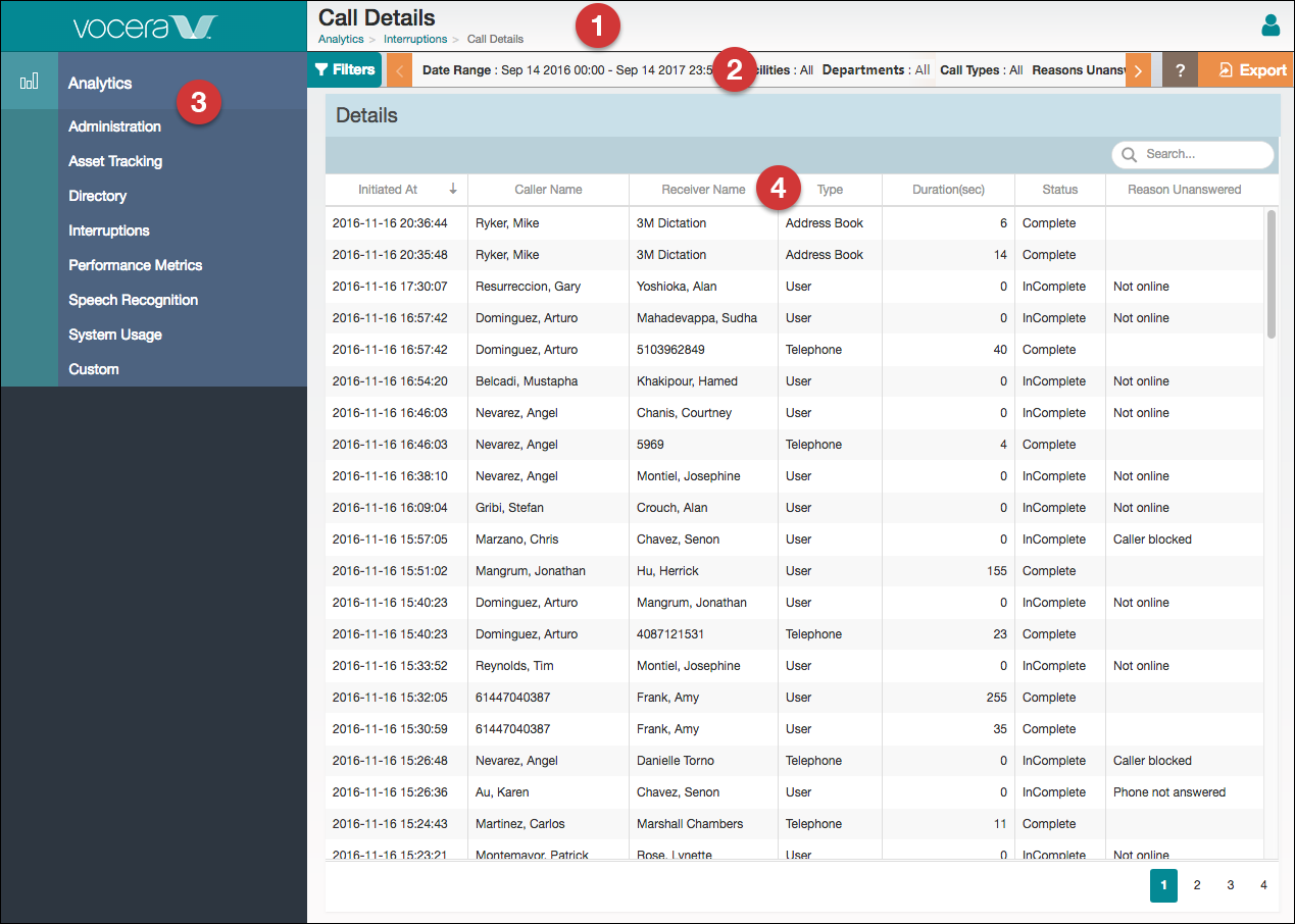 | 4 | Content Area | Displays dashboards and reports within Vocera Analytics. The bulk of the work done within the application takes place here. |