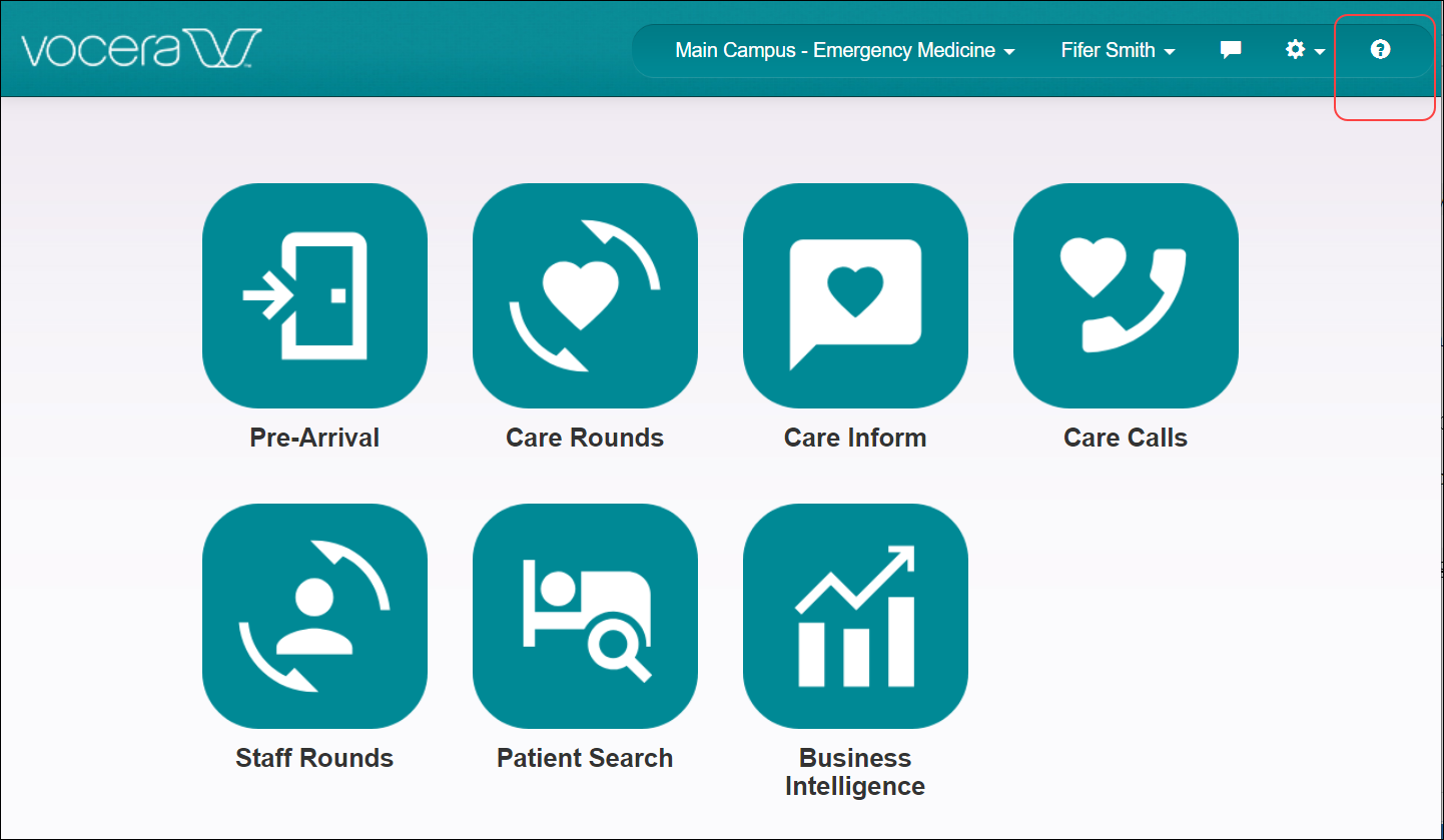 Click the Help icon in the toolbar of the VCE application to access this Vocera Care Experience Rounding User Guide.