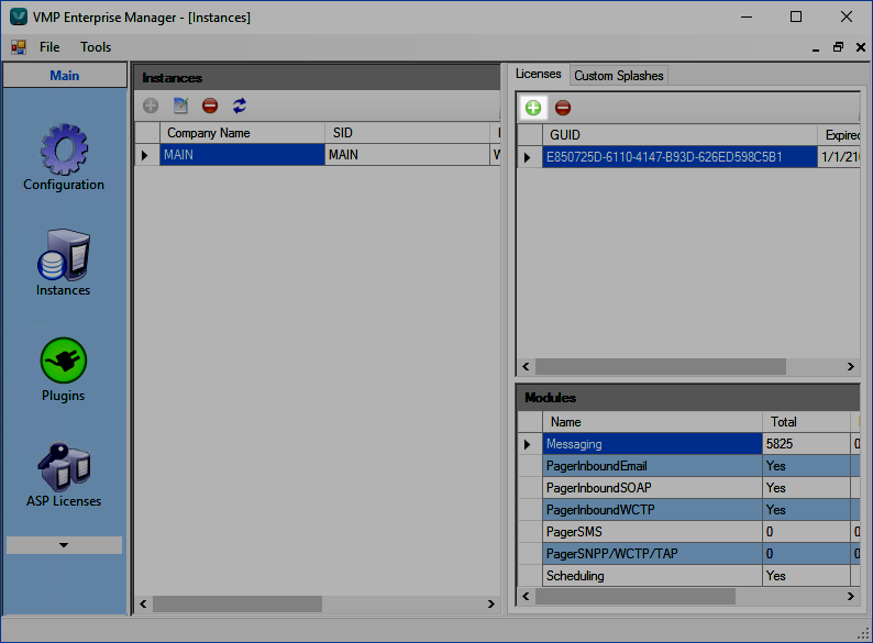 The Modules panel displays the details of your license. In particular, note that the PagerInboundEmail, PagerInboundSOAP, and PagerInboundWCTP fields specify whether your VMP Server is licensed to use any of the inbound Email, SOAP, and WCTP connections, respectively.