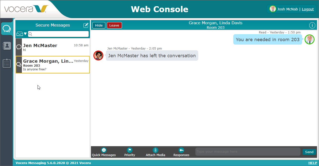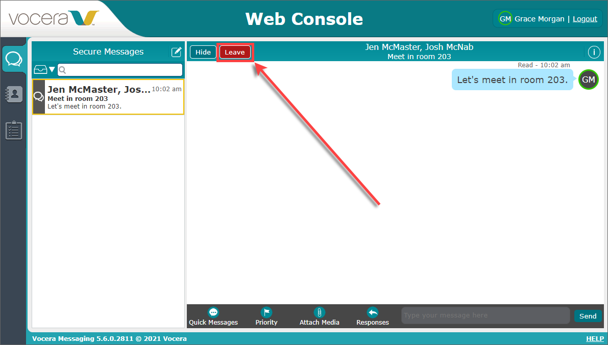 If a Vocera Secure Texting user is in the conversation that you have left and sends a message to the conversation, you are automatically added back to the conversation, and users are not notified that you have returned to it.