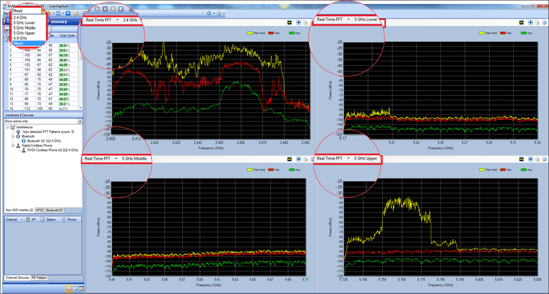 The AirMagnet Spectrum XT is a tool used to capture the real-time view and radio frequency (RF) bands for 2.4 GHz and 5 GHz.