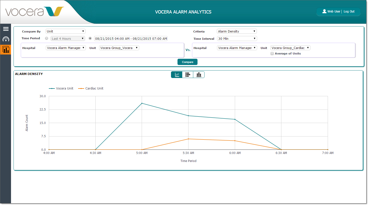 You can compare the alarm density in any two hospital units over a specified time period.