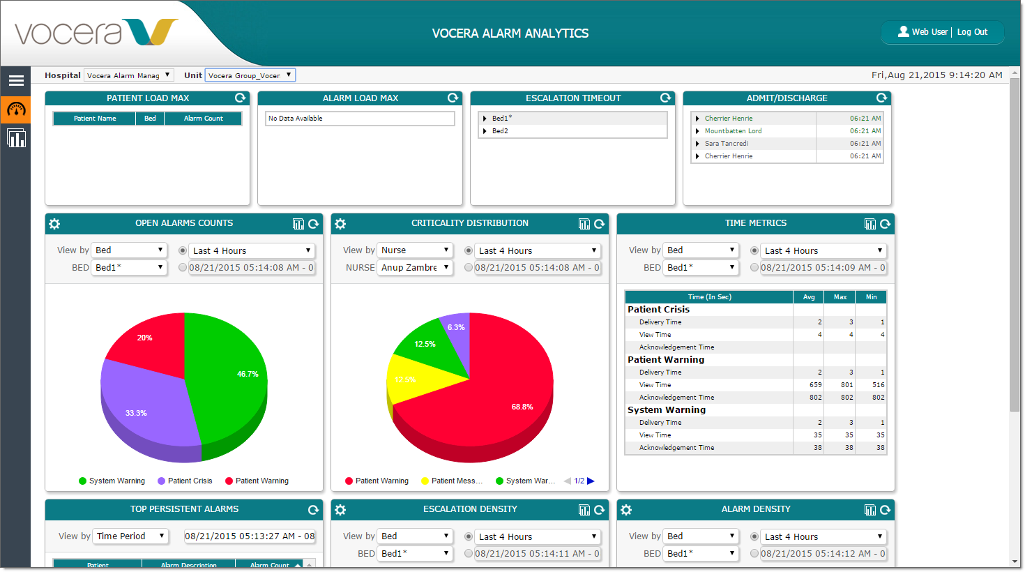 In the Vocera Alarm Analytics screen, you can view a dashboard that displays statistics on the most recent alarms generated in the unit that you specified when you logged in.