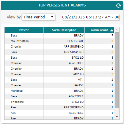 In the Vocera Alarm Analytics dashboard, the Top Persistent Alarms pane enables you to view a list of the alarms that have been repeated the most frequently.