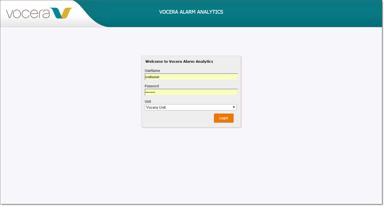 Follow these steps to log into the Vocera Alarm Analytics main screen.