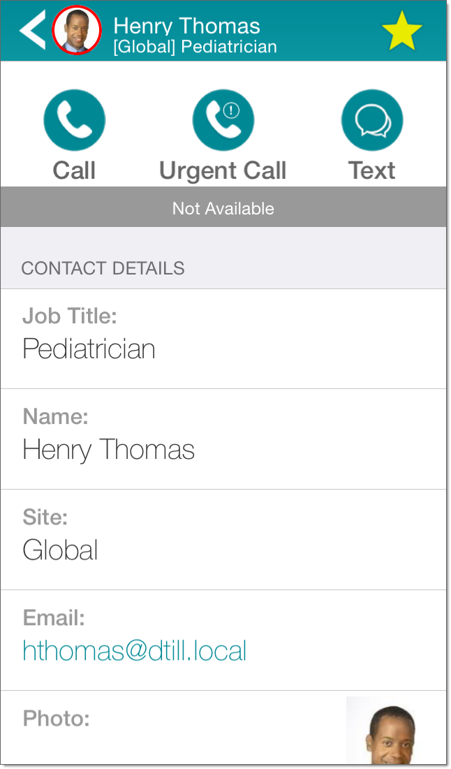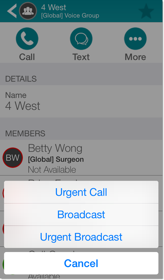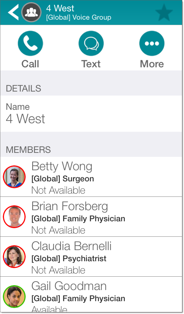 From a contact details page for a Vocera group or Distribution List, you can communicate with the contact in some or all of the following ways: