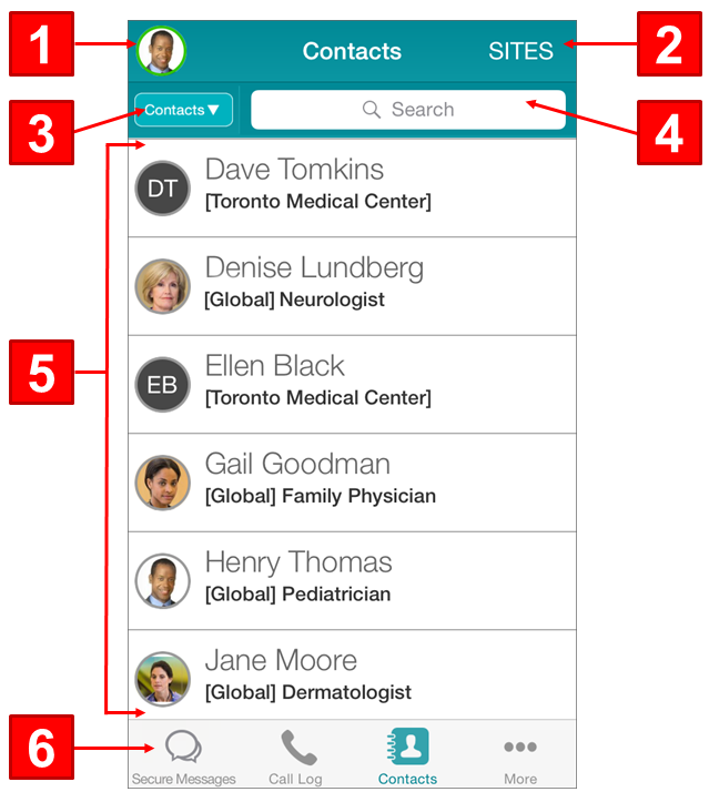 Contacts in the navigation bar. This diagram shows the layout of the Contacts screen: