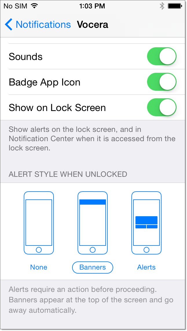 To specify notifications and the notification alert style, tap Settings > Notifications > Vocera, and change the settings as desired.