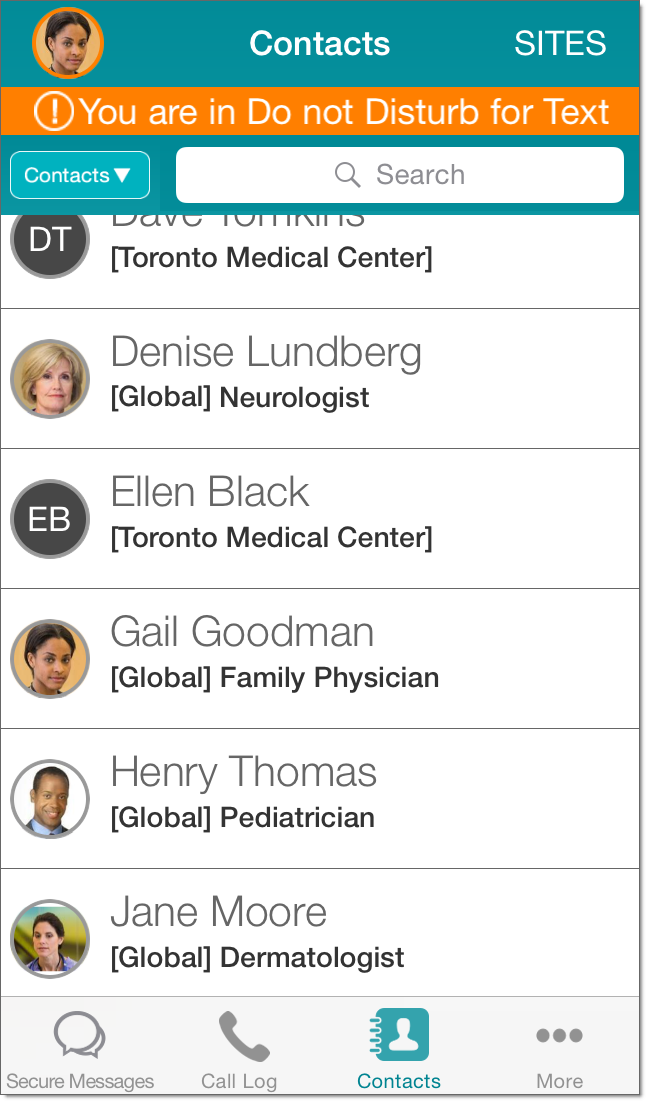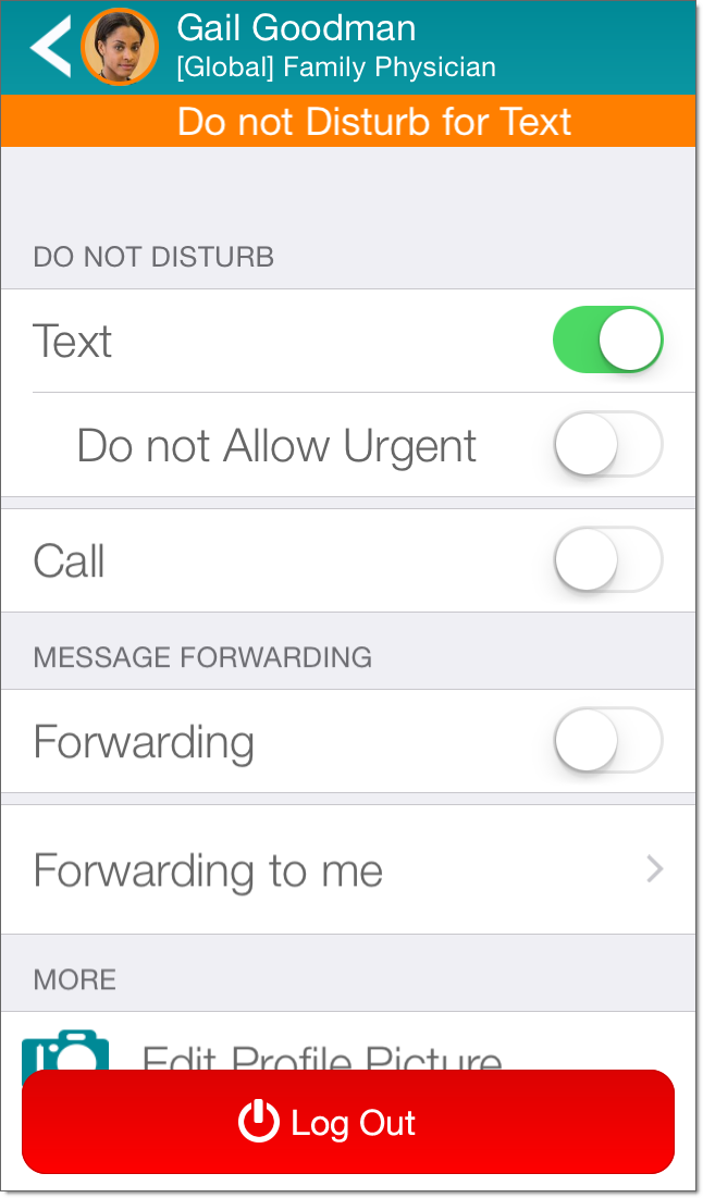 Do Not Disturb notification settings appear in an orange banner at the top of the Secure Messages screen. You can turn the Do Not Disturb settings on or off.