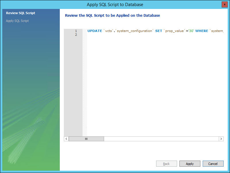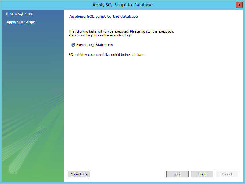 Apply SQL Script to Database window.