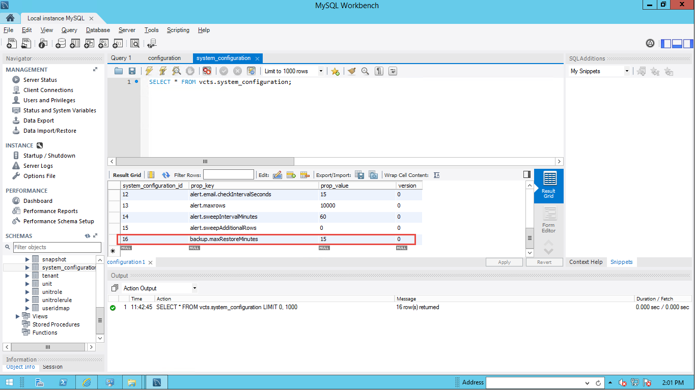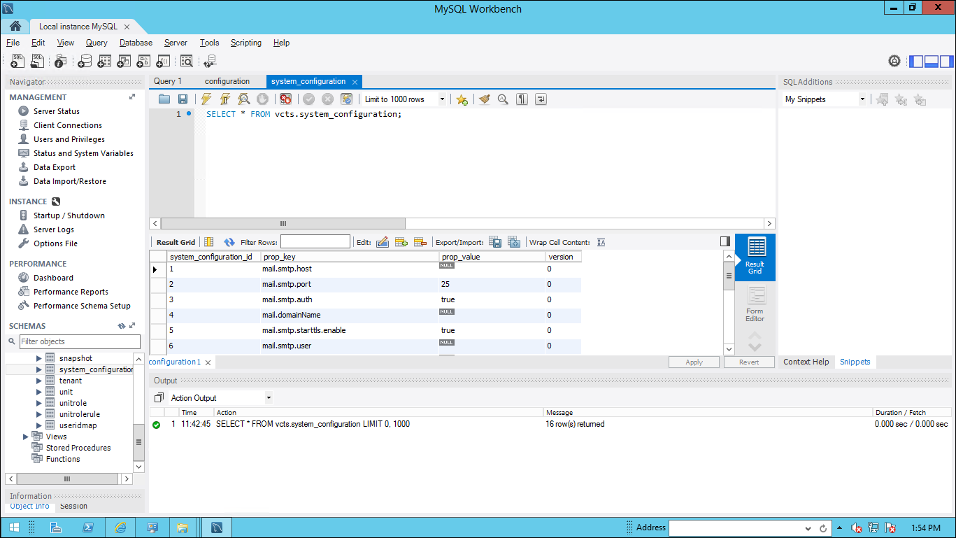 A grid showing values in the rows and columns of the system_configuration table appears.