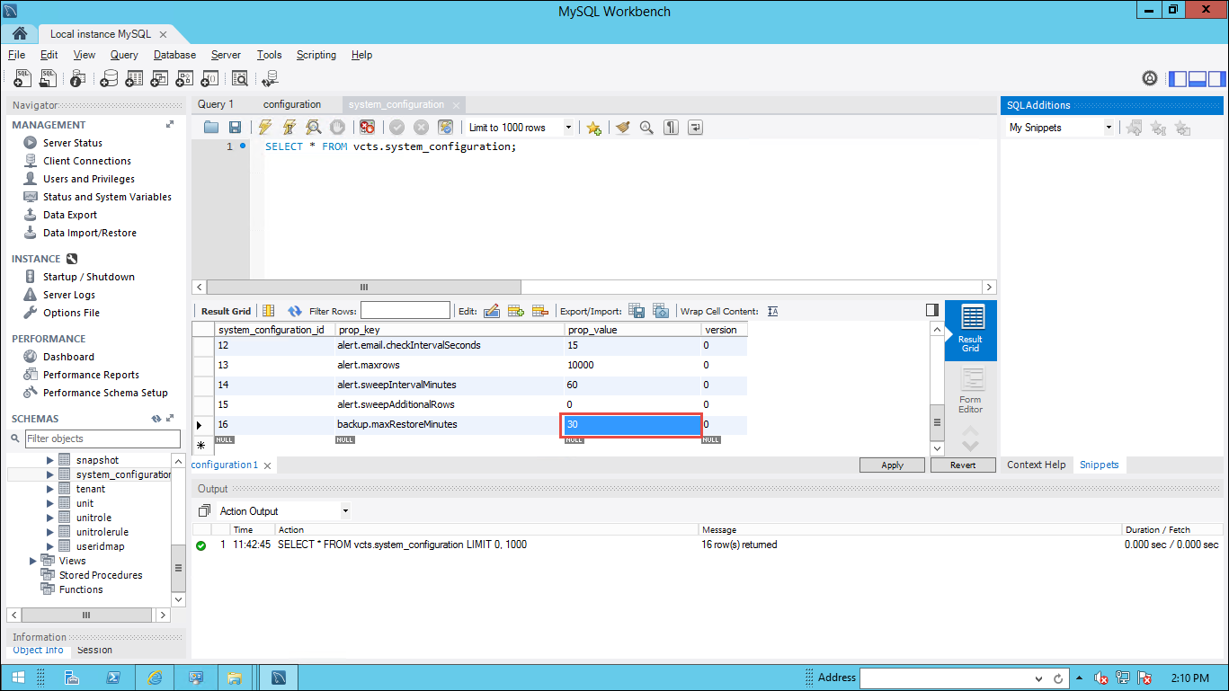 In the backup.maxRestoreMinutes row, click the value in the prop_value