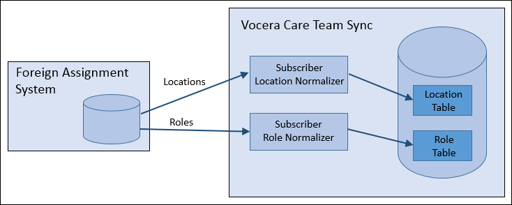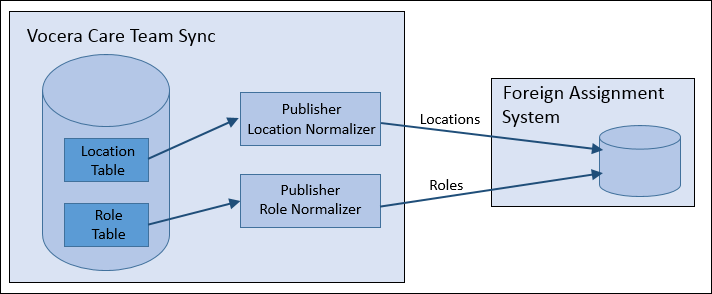 When CTS is the source of truth, it is the publisher of assignments; when the foreign end point is the source of truth, CTS is the subscriber. Consequently, a publisher normalizer transforms either CTS roles or locations into the role or location representation required by the foreign end point. A subscriber normalizer transforms the foreign roles or locations into the representation required by the CTS.