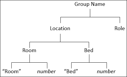 You can think of a group that is input to the localizer as a branching tree of nodes. For example, a template such as {Room} {$Room#([100‑199],1,3)} {Bed} {$Bed#} {$Role(1,3)} allows a group name such as Room 1 0 3 Bed 2 Nurse; you can visualize this group as a branching tree with a structure similar to the following: