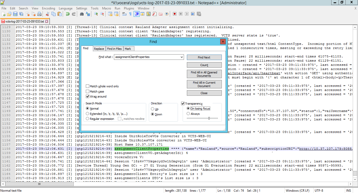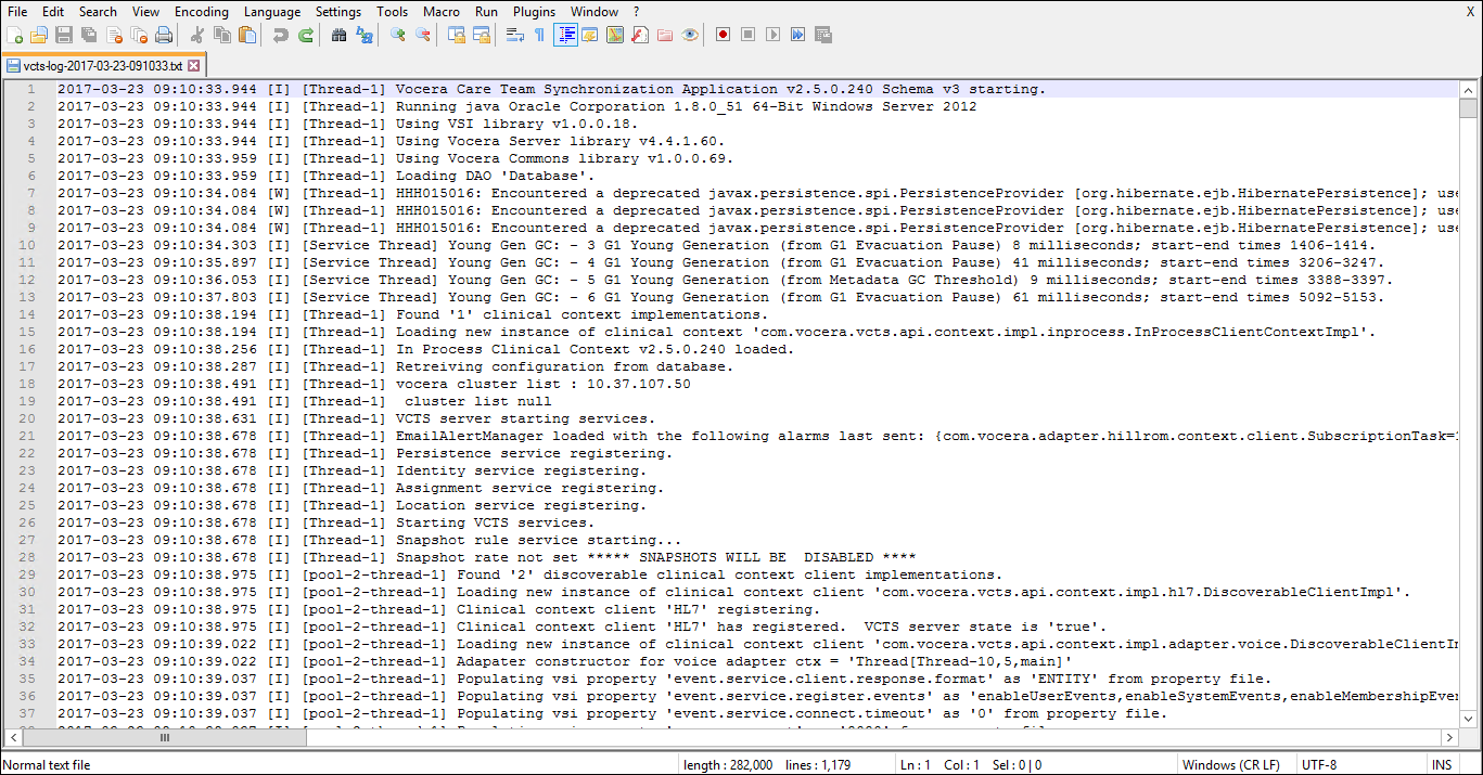 CTS maintains logs in the \vocera\logs directory. The date and time that the each log file was created is specified in the file name as vcts-log-<date>-<time>.txt. CTS creates a new log at midnight every night, as long as an assignment client is connected.