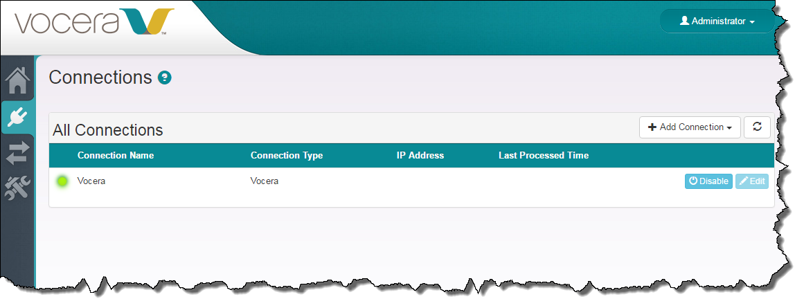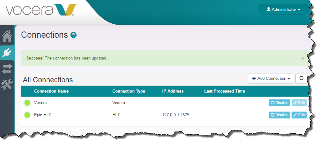 When the Vocera Care Team Sync-to-HL7 connection is set up correctly, a green light icon (enabled) appears next to the connection in the Connection Name column of the Connections screen.