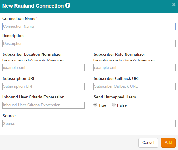 The Subscriber Role Normalizer normalizes role data such as RN, PCT, and LPN that is used by the foreign system to match the values in CTS. This normalizer is required to resolve naming differences between the two systems. Enter the location of the normalizer relative to the \vocera\vcts\resources\ path on the CTS machine. You may optionally create a directory structure under resources to provide separate directories for the normalizers used by different connectors. |