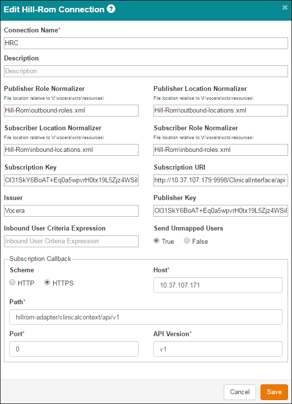 Edit the Hill-Rom connection at any time to update the configuration parameters. After saving, you must restart the Vocera