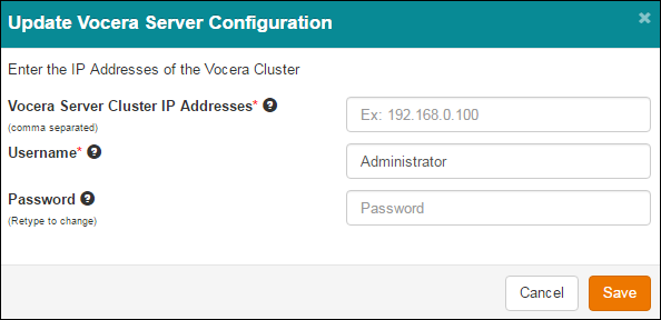 2. Enter the comma-separated list of network addresses for the Vocera Voice Server cluster nodes in the Vocera Server Cluster IP Addresses field. If you do not have a cluster, enter the network address of your standalone Vocera Voice Server.
