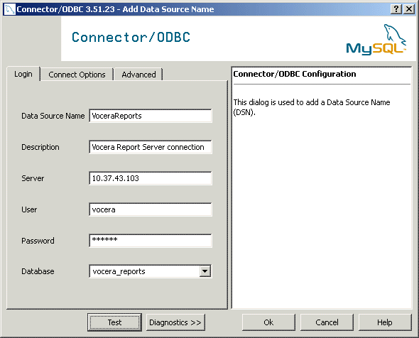 Vocera Report Server requires MySQL Connector/ODBC 3.51.27 or later.